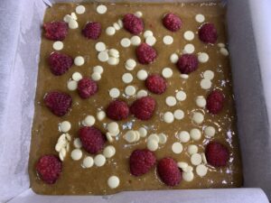 6. Vertemos la masa en el molde elegido y le ponemos por encima el restante chocolate blanco y las frambuesas.