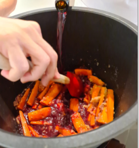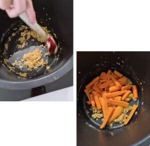 5.- Al sacar la carne, si limpiar el caldero, ponemos un poco de harina y la pasamos. Una vez esté hecha ponemos las zanahorias y la mezclamos bien.