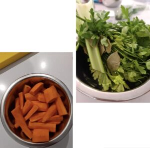 2.- Hacemos un bouquet de hierbas atado con hilo de cocina, en los que tenderemos el perejil, el apio, laurel y tomillo fresco.