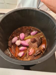8.- Cuando lleve su tiempo, más de una hora, le ponemos las chalotas, no antes porque si no, no podríamos sacarlas enteras.