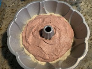 14.- Vertemos la mezcla de fresa sobre la de vainilla sin llegar a los bordes.