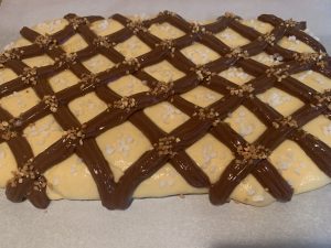 - Metemos la crema pastelera de chocolate en una manga o en una bolsa con un agujero y hacemos las líneas de crema. Terminamos decorando con azúcar perlado y crocanti de almendras.