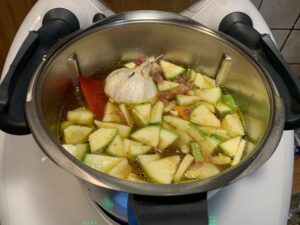 - Todos los ingredientes al vaso de la Thermomix o robot que tengas y programamos 30 minutos, 100º, giro a la inversa y Velocidad Cuchara. Si es el caldero, echamos todos los ingredientes, en crudo, sin hacer fritura, y removemos de vez en cuando para que no se peguen.