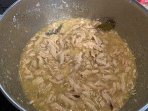 5. Le picamos la manzana, añadimos el laurel, tomillo y el pollo.