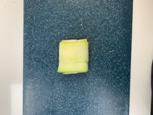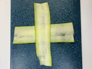 Tendrás que cortar lonchas muy finas, con un pelador, a lo largo del calabacín, hacer una cruz con el mismo, rellenar y cerrar como un saquito.