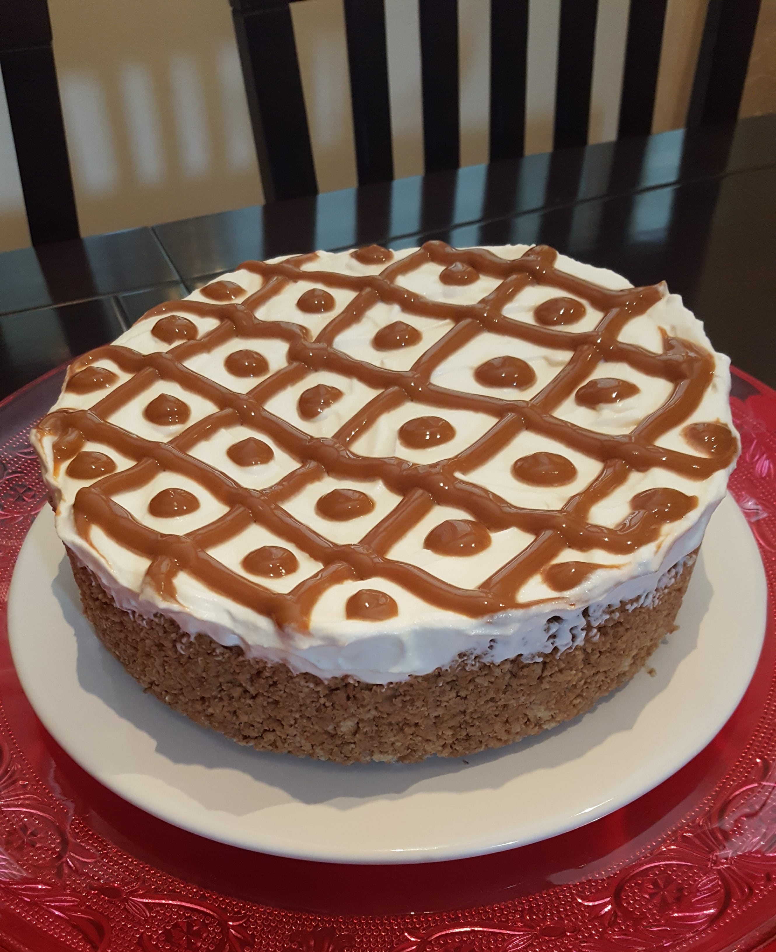 - A la hora de servir, desmoldamos y yo decoro con tiras de dulce de leche haciendo cuadraditos pero también podemos decorar con virutas de chocolate.