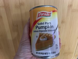 La calabaza la podemos asar, o meter en el microondas o guisar escurriéndola muy bien. Otra opción es comprar esta lata, es lo que yo he hecho esta vez. Aquí solo la consigo en Food Store y se agota rápidamente.