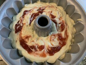 - Vertemos una parte en el fondo del molde y encima le ponemos mermelada haciendo remolinos, volvemos a repetir la operación de masa y mermelada y por último la masa.