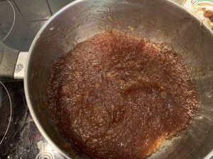 - Pasamos todo lo que hemos sacado a una cacerola, lo pesamos y le ponemos la misma cantidad de azúcar.Podemos reducir el azúcar hasta un 25%.
