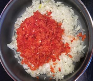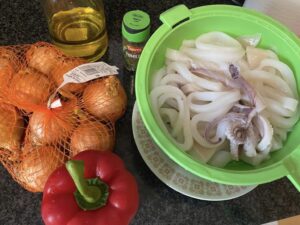 1.- En una sartén ponemos un chorro de AOVE y ponemos las cebollas troceados y el pimiento, a pochar.