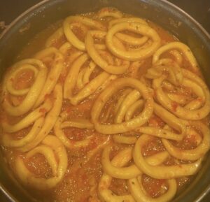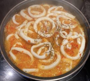 2.- Cuando ya esté hecha la salsa, le ponemos las anillas, sal, azafrán o colorante y el tomillo, tapamos y dejamos un ratito para que vaya guisándose.
