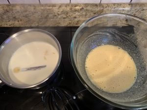 - Le quitamos a la leche infusionada la canela y el limón y la vertemos encima del cuenco de los huevos.