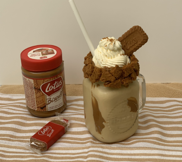 1. Untar la boca de la jarra con crema de Lotus y pegar  las galletas partidas en trocitos pequeños. Meter la jarra en la nevera para que se peguen bien.