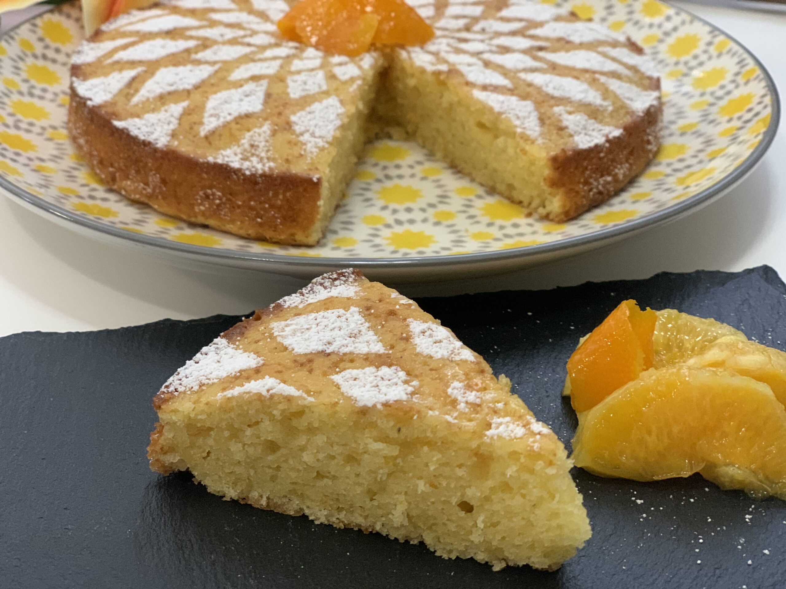 Se hace en nada, en memos de 45 minutos tienes un pastel para merendar que no te va a defraudar. Las naranjas que sirven de acompañamiento son para decorar o para comértelas, claro, pero si quieres las puedes omitir.