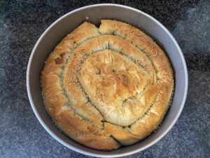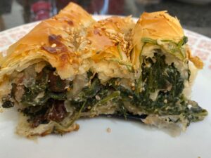 El resultado será riquísimo y la forma en que la hicimos la hace también bonita a la vista, aunque se puede hacer en forma de pastel intercalando tres láminas de masa filo y mezcla y así hasta cuatro veces.