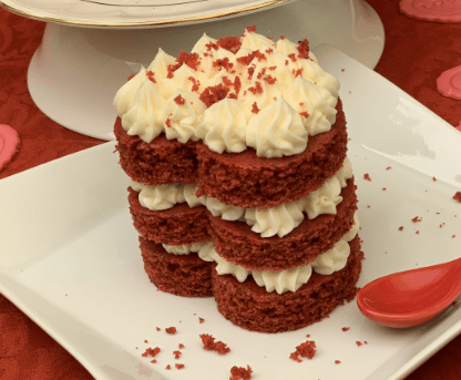 - Con un cortados de galletas en forma de corazón, recortamos la masa y comenzamos a montar las tartitas, poniendo crema entre piso y piso y decorando al final con más crema y migas del bizcocho.